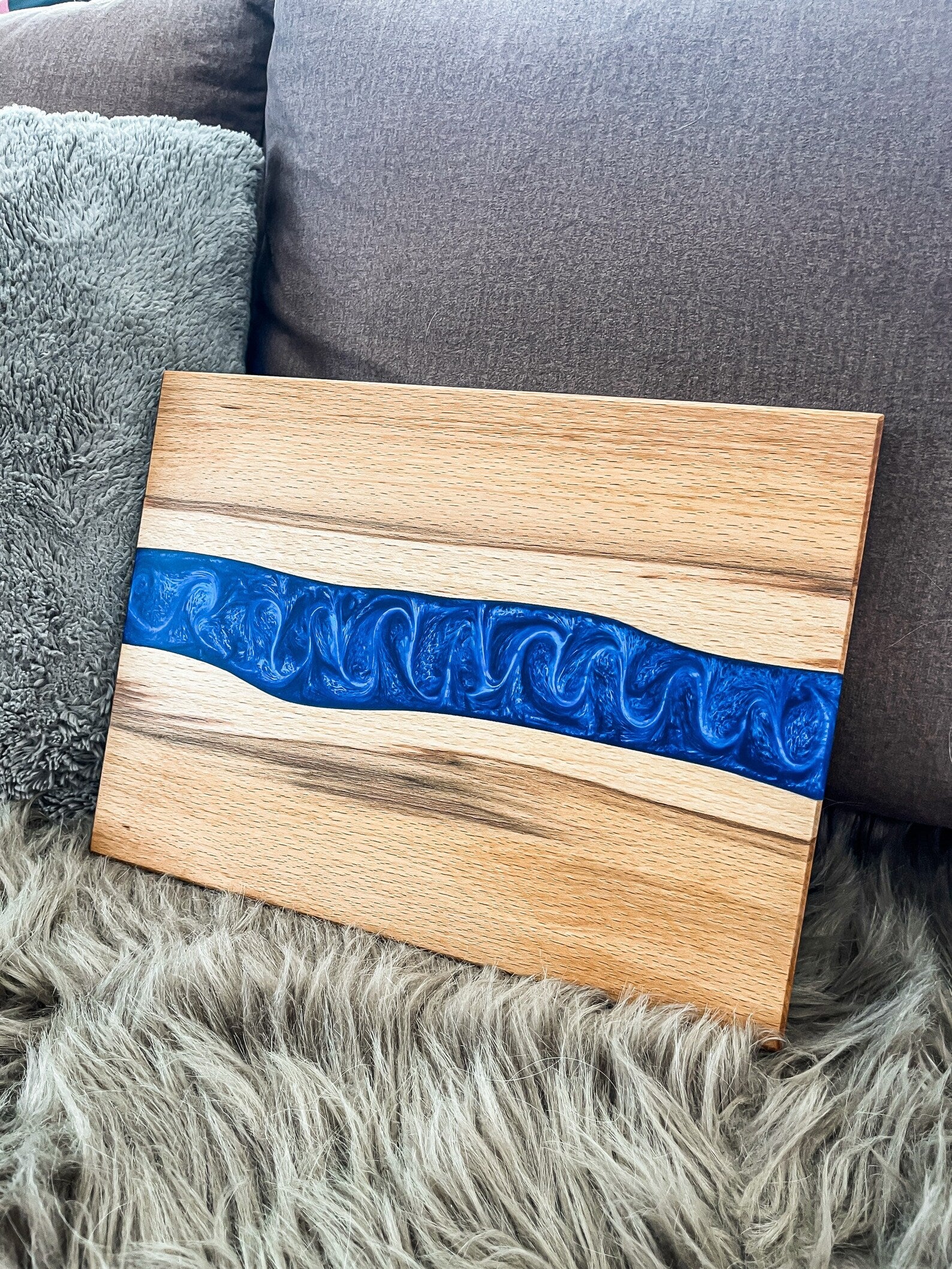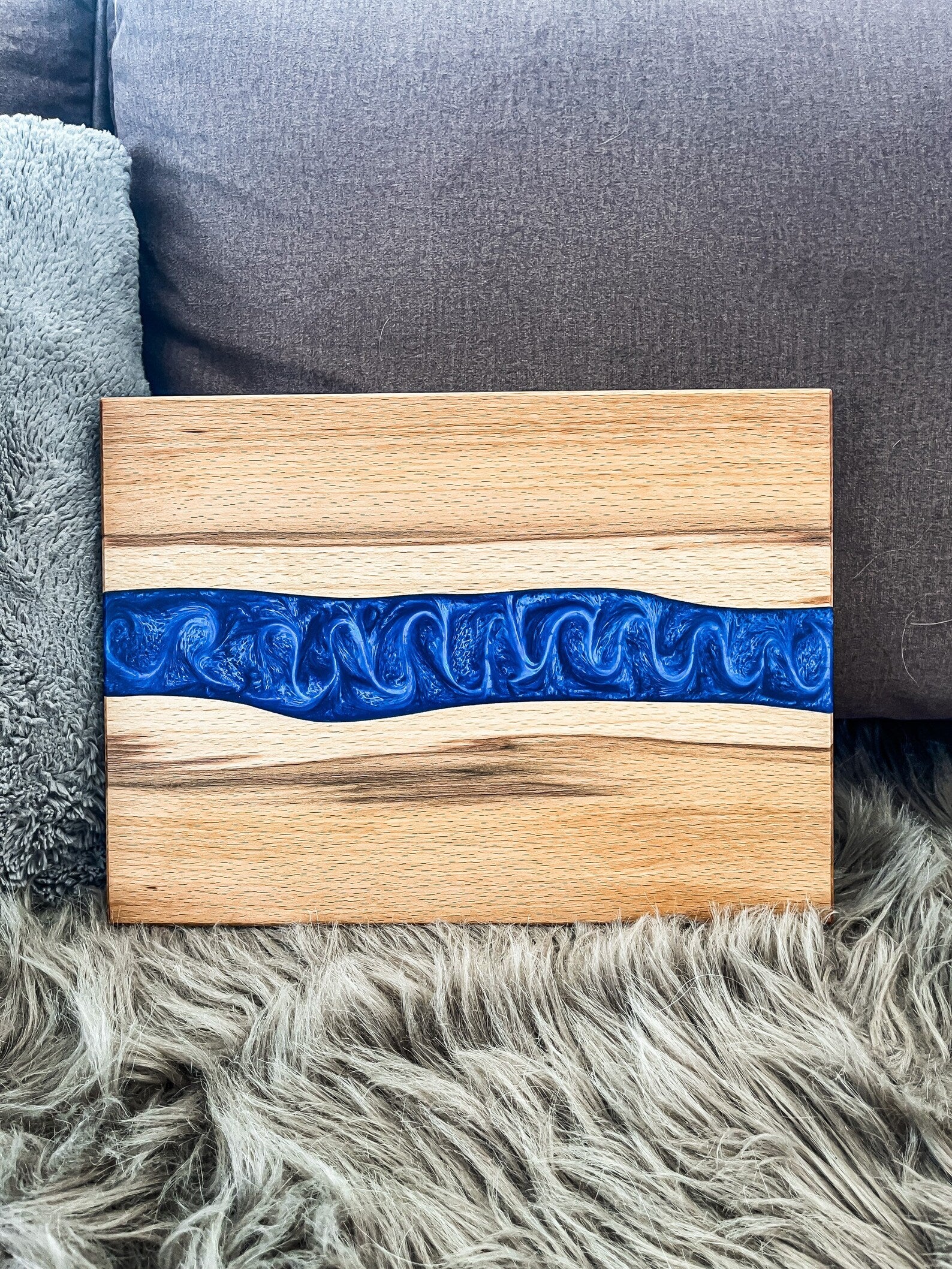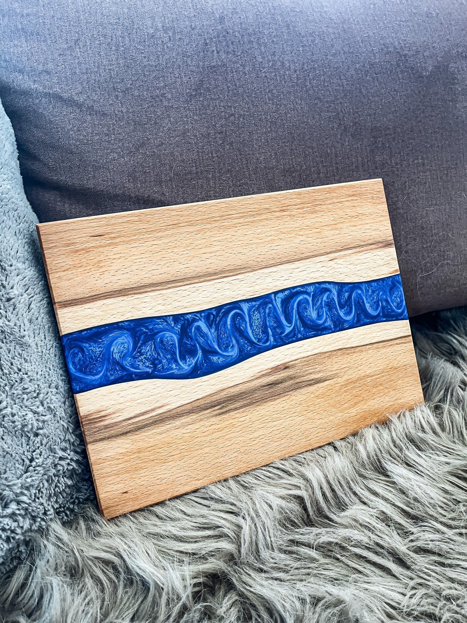 Handgefertigtes, hochwertiges Küchenbrett / Schneidebrett / Servierbrett gefertigt aus wunderschönem Holz der Kernbuche und blau eingefärbtem Epoxidharz.